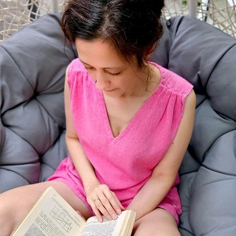Beata, who is wearing a pink T-shirt in size S, is 165 cm tall. Beata is officially the Chairwoman of the Supervisory Board, but she is also involved in many other areas – she supervises the creation of textile products, monitors subcontractors, creates internal procedures, and ensures overall order. In her limited free time, she enjoys sewing her own designs from our fabrics and pursuing her hobby of sewing her own designs from our fabrics. she sews her own designs from our fabrics as a hobby and sues officials for exceeding their powers 😉